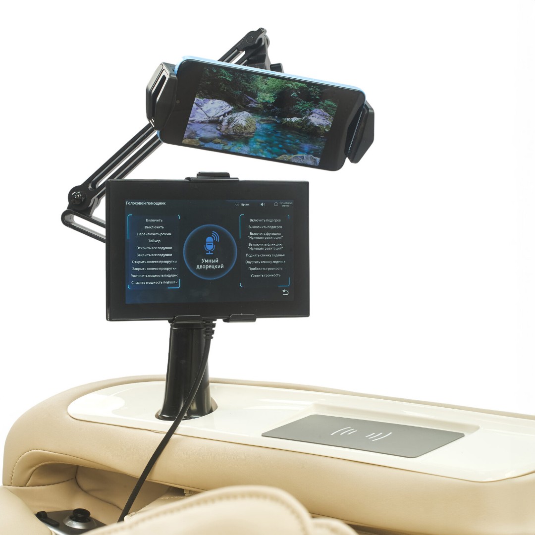 - В комплекте удобная подставка под телефон или планшет, которым можно управлять специальным джойстиком, встроенным в подлокотник, не отвлекаясь от массажа
