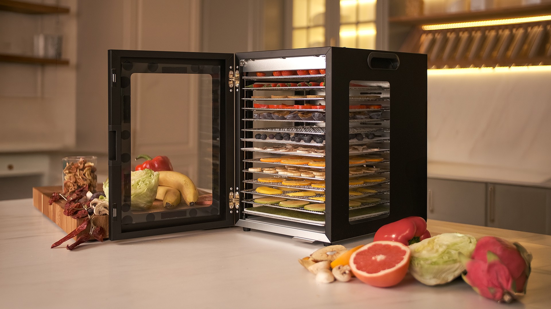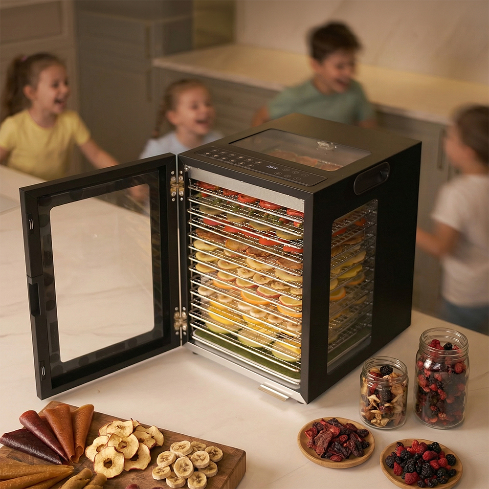 Чёрный корпус из нержавеющей стали, устойчивый к нагреву, влаге и коррозии, выглядит лаконично и современно, легко вписывается в интерьер кухни или мастерской. Внутри установлено 14 поддонов из нержавеющей стали с зазором 25 мм — этого достаточно, чтобы удобно размещать ломтики фруктов, травы или мясные полоски.