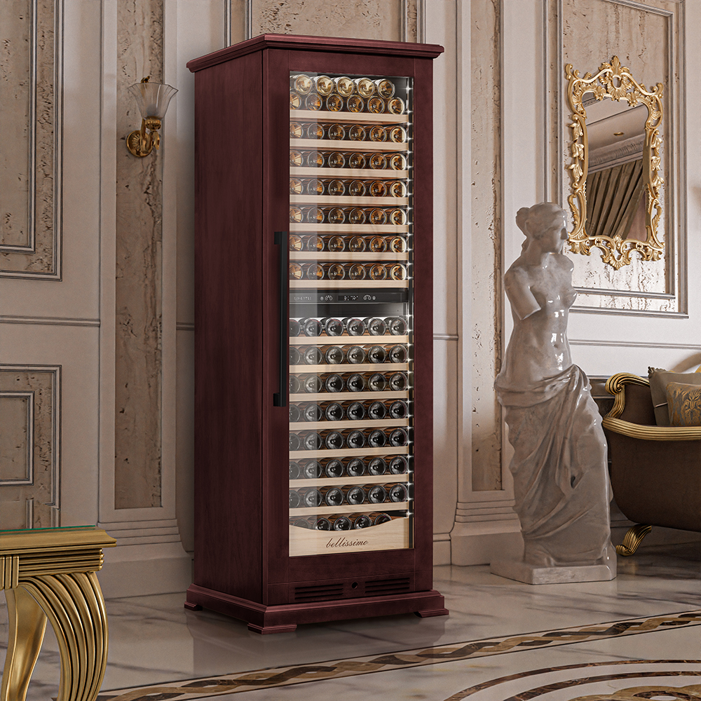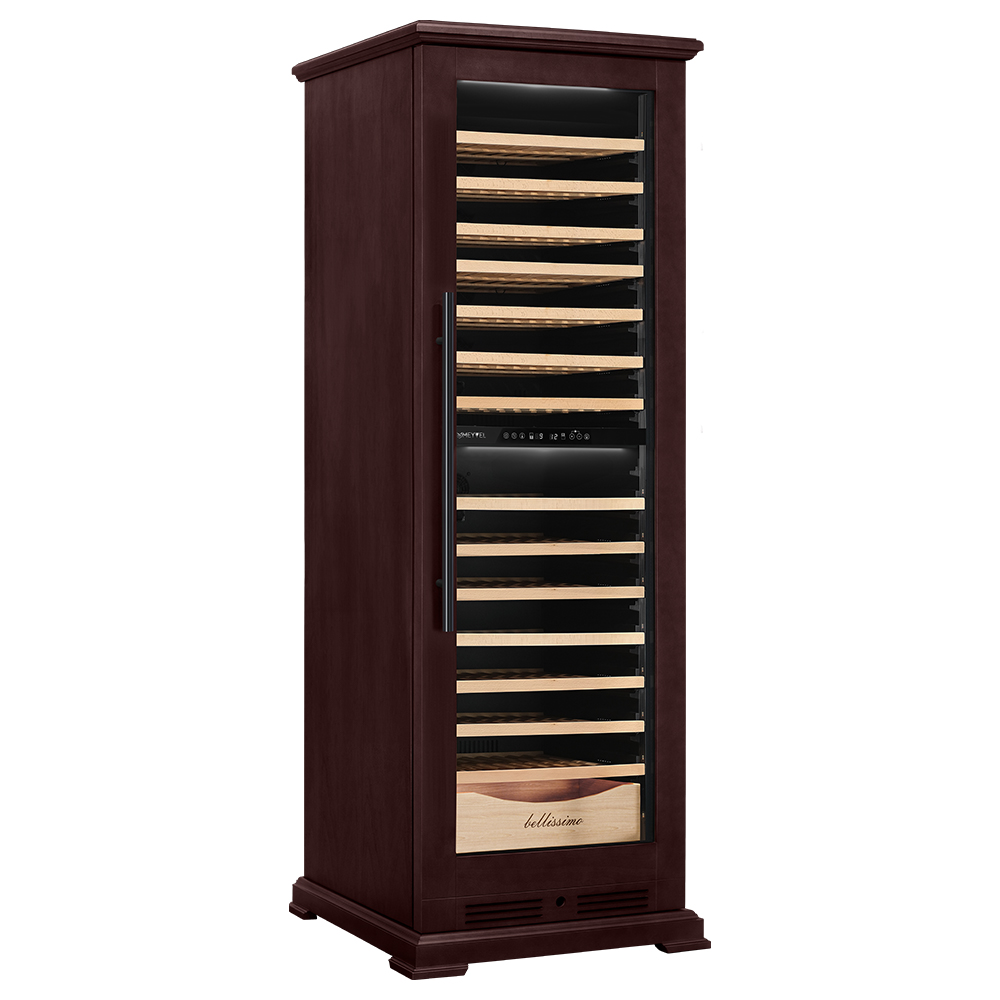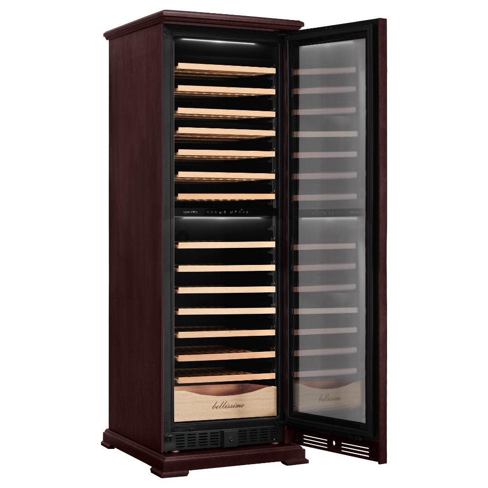Винный шкаф предназначен для профессионального и длительного хранения различных сортов вин (до 174 бутылок типа Бордо). Он так же оснащен дверью с защитой от ультрафиолетовых лучей и поддерживает влажность в диапазоне 60-80%, как в настоящем винном погребе. Стальной корпус обшит натуральным буком, который выдерживает большие нагрузки и обладает красивой текстурой.