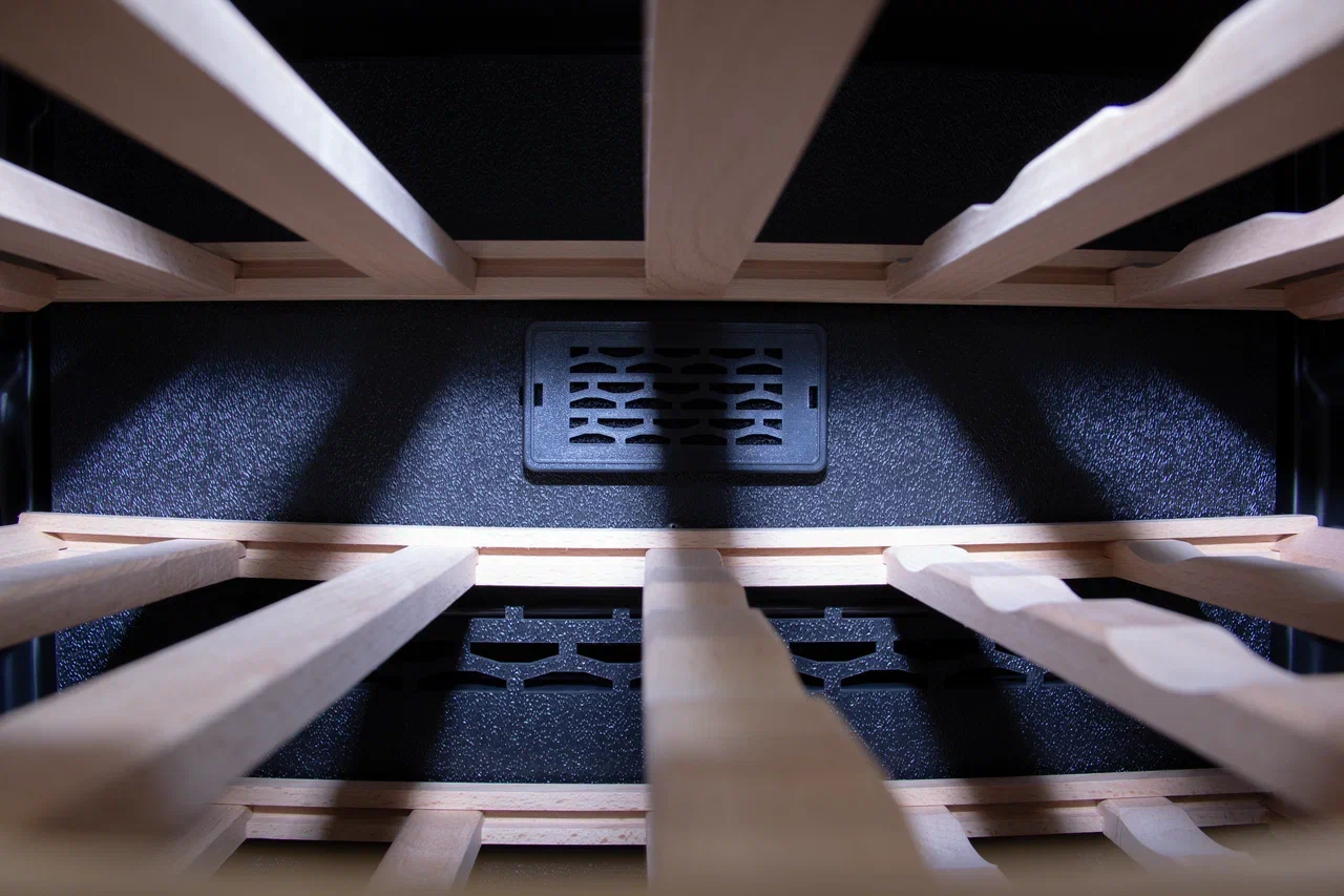 Благодаря стеклянной двери с УФ-тонировкой, гарантирующей защиту вин от солнечного света, можно изучать содержимое, не открывая шкаф. Полки из дерева обеспечивают безопасное размещение бутылок, а мягкая светодиодная подсветка придает шкафу элегантность.